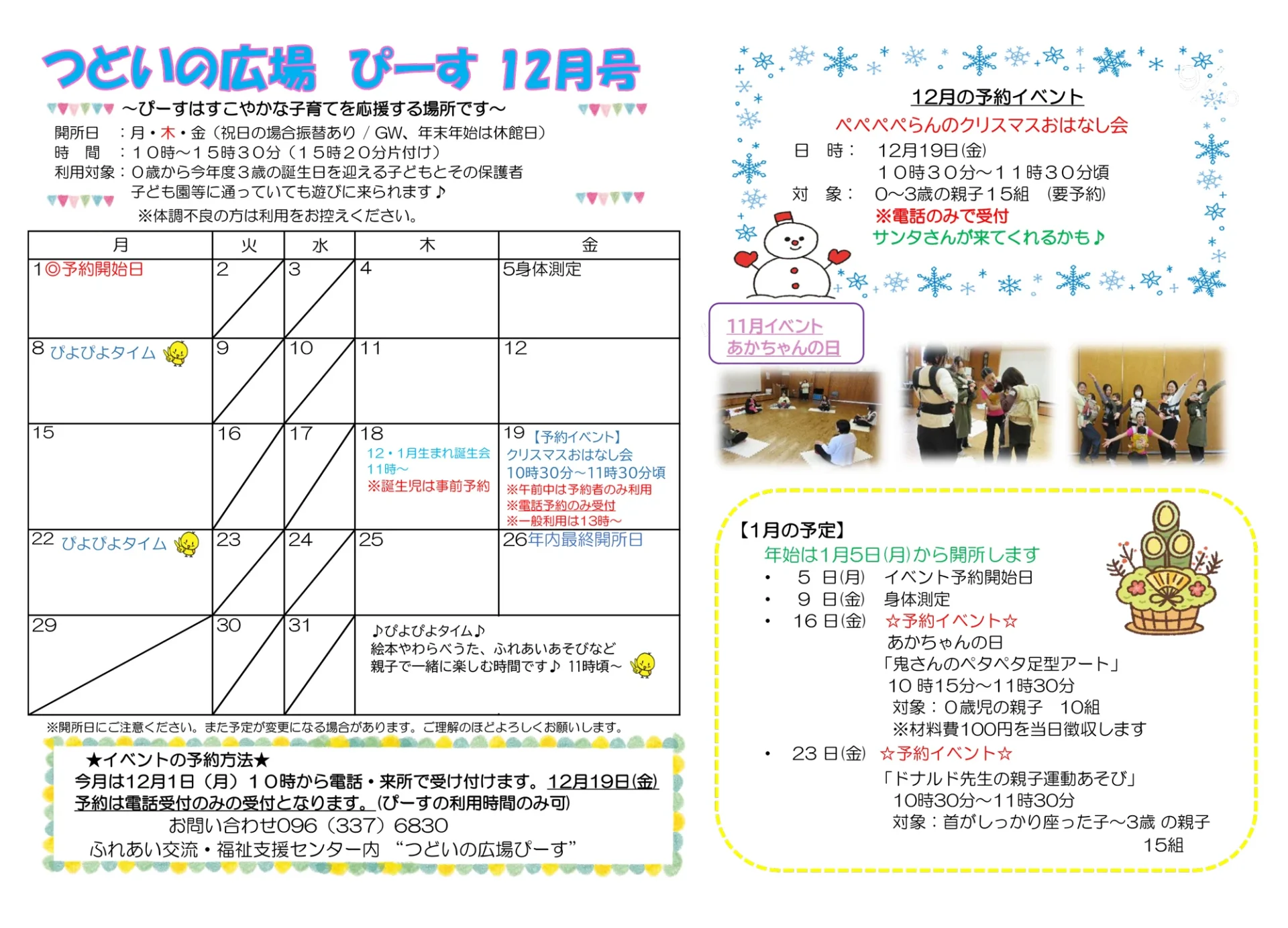 つどいの広場ぴーすはおおむね3歳未満の子どもと保護者の方が参加できます。 一度遊びに来てみませんか? お待ちしています♪ この記事をシェアする 前へ 投稿 10月21日(火)ふれあい総合相談(財産相続相談)の中止のお知らせ 次へ 投稿 年末年始休業のお知らせ